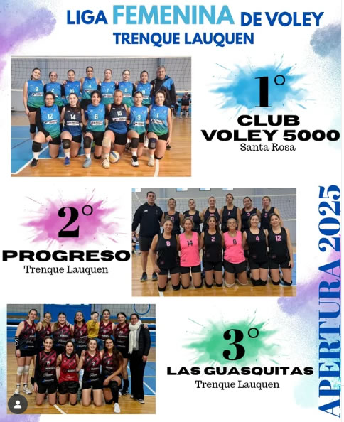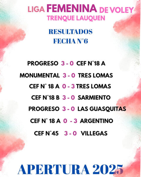 Estos son los resultados de la sexta y última fecha del torneo Apertura de la Liga Femenina de Vóley, cuyo primer certamen del año fue para Vóley 5000 de Santa Rosa, La Pampa.