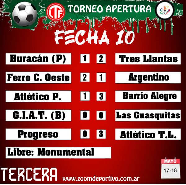 Así, la tabla de posiciones en primera, con una jornada por disputarse, quedó así: Monumental 22 puntos; Ferro, 18; Huracán y Argentino, 17; Las Guasquitas, 15; Barrio Alegre y Atlético Pellegrini, 14; G.I.A.T., 10; Atlético Trenque Lauquen, 6; Progreso, 4; Tres Llantas, 2.