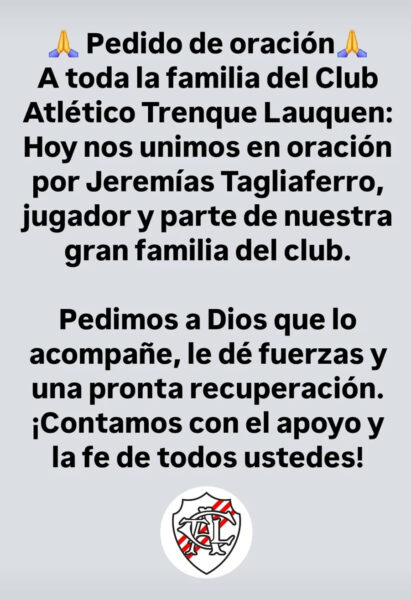 Luego de conocerse la noticia del accidente en moto en el que estuvo involucrado el futbolista local Jeremías Tagliaferro, rápidamente el ambiente del deporte se hizo de eco para pedir cadenas de oraciones y rezar por su pronta recuperación. Compartimos la publicación de Atlético Trenque Lauquen: